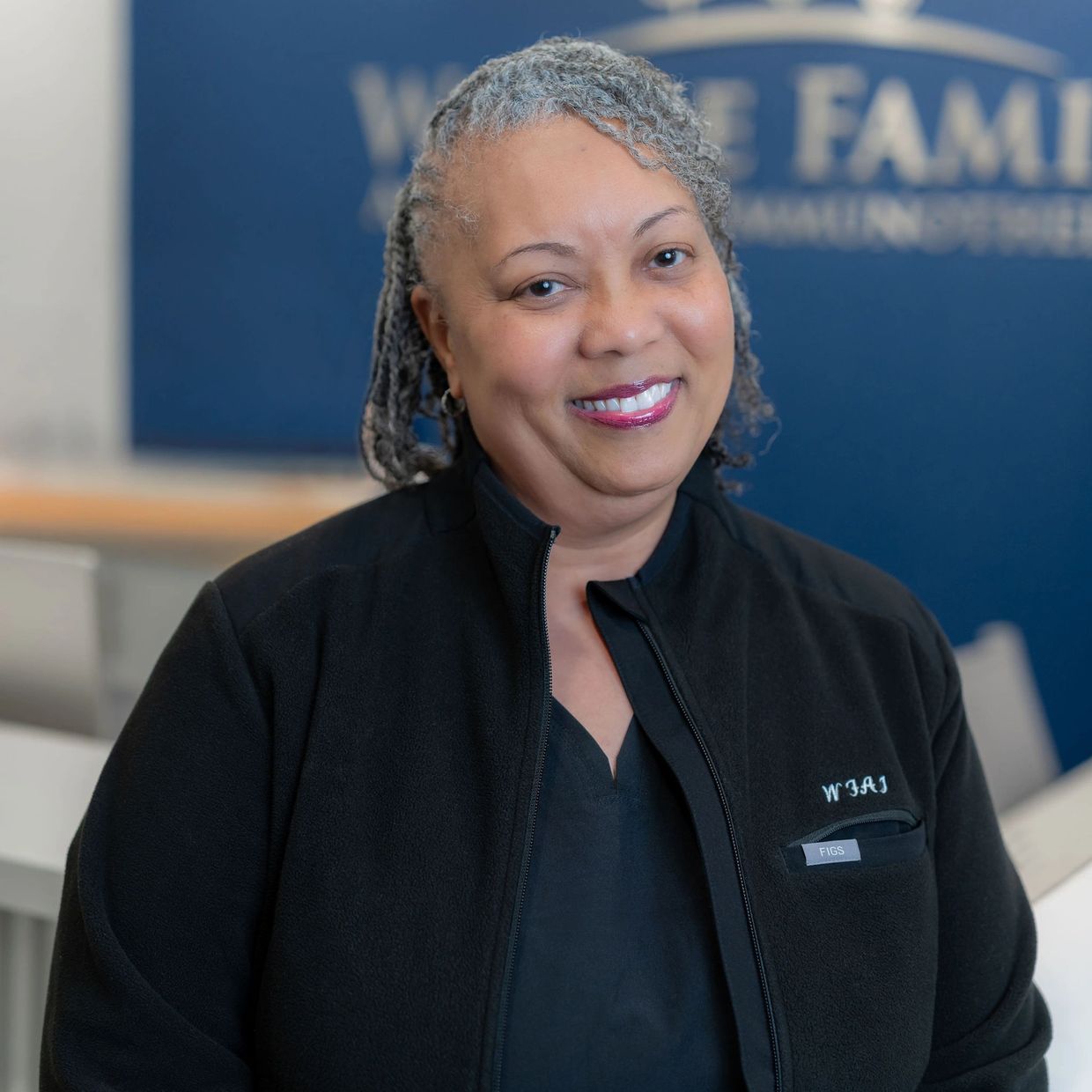 Peaches is our allergy shot specialist. She has been an experienced allergy medical assistant for so long she can do this with her eyes closed. She has 35 plus years experience within the DC area. No one gives better shots than Peaches and she is training everyone to do it as well! Peaches is an RMA who is passionate and prides herself on helping her family, pateints and others. She sees this as more than a job, it is a career and calling that she loves. She is grateful to be here with the WFAI family and wer are grateful to have her as well.