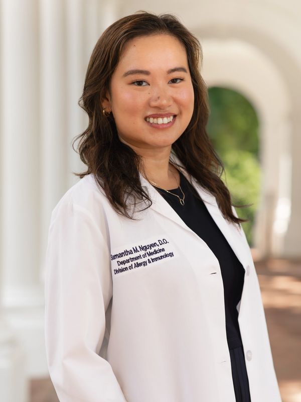 We are very excited to welcome Dr. Sam Nguyen to the practice as our new doctor! She graduated from VCOM–Blacksburg in 2020, completed her Internal Medicine residency at Wake Forest, and recently finished her Allergy and Immunology fellowship at the University of Virginia. Her clinical interests include pediatric food allergies, eosinophilic esophagitis, allergic rhinitis, and asthma. She has experience with oral food challenges and multi-food oral immunotherapy, and is excited to care for families managing food allergies.